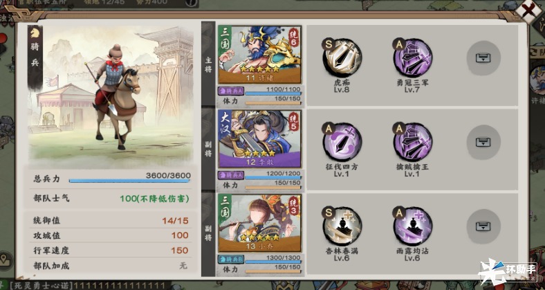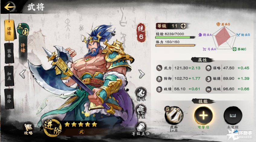 游戏中,许褚是位进攻属性拉满的攻击型战将,其自带技能“虎痴”可让他在普攻后对敌军全体造成武力伤害,其在担任主将时更是能概率得到破甲效果的加持。若为他搭配“左右开弓”“奋勇当先”等带群攻或连击效果的技能就能增加突击效果触发次数,从而进一步释放其突击潜能,能够对敌人造成一轮恐怖杀伤。