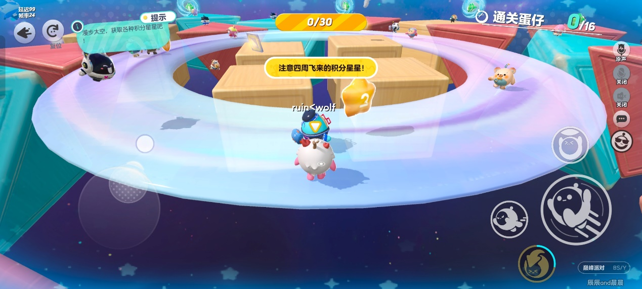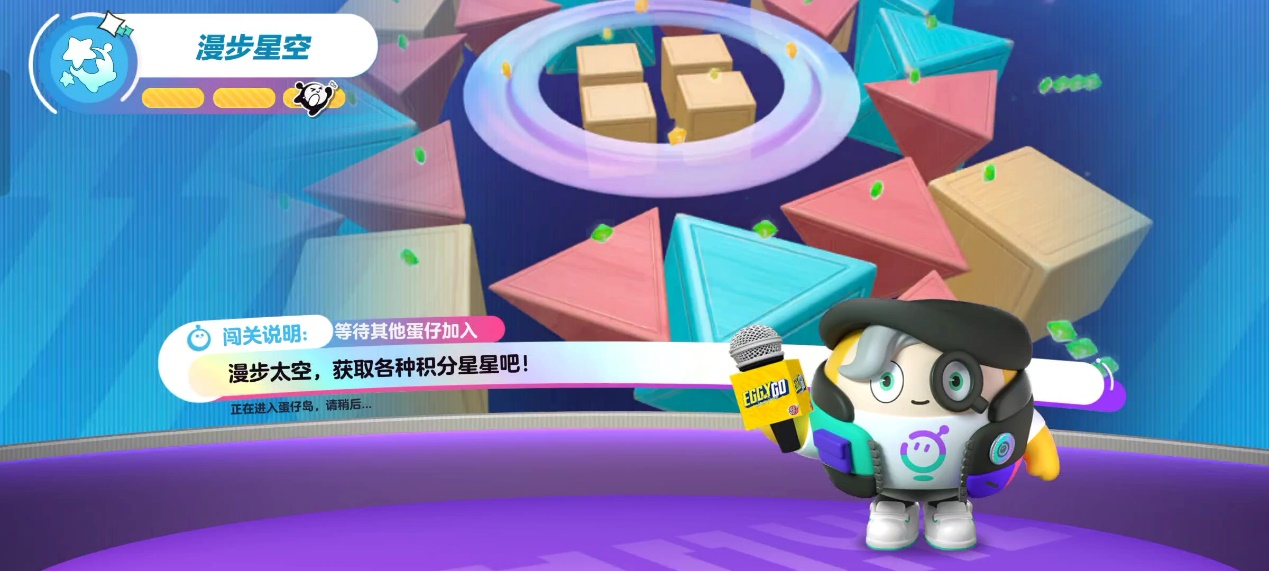 地图中心是一个星球,周围有一圈可以站立的星环,再外围就是一堆零散的大箱子了,玩家的出生点就在箱子或者星环上。周围会不断喷出积分豆,率先吃到30分就胜利,最后八个人会淘汰。这个地图也是低重力环境。