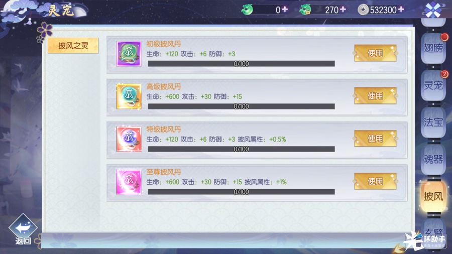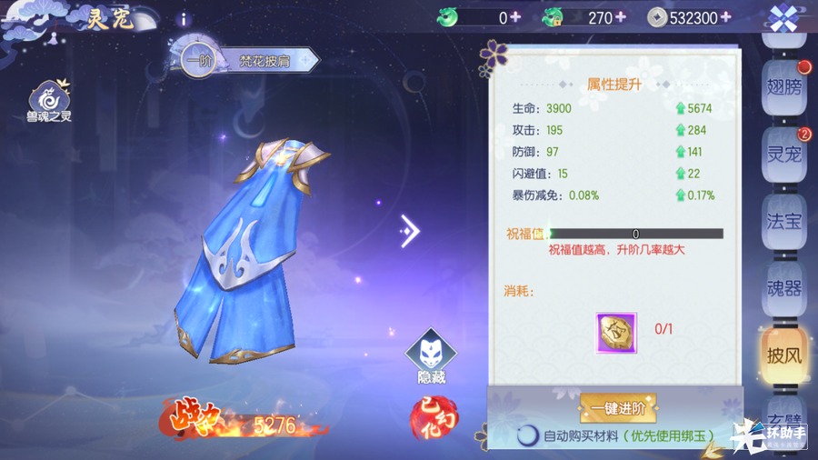 披风其实是防御类的装备,其技能也展示了它的作用——爆伤减免,不断消耗披风进阶石进行进阶吧,要记着,活着才有输出!