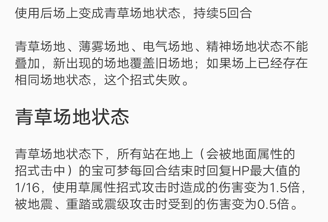 地上的宝可梦每回合回复1/16血量(虽然也会福利对方,但是不要在意这些,关键的就是草属性招式威力会x1.5,受到地震,重踏级别攻击是伤害削弱成0.5倍,千剑除外,这个不属于直接接触)