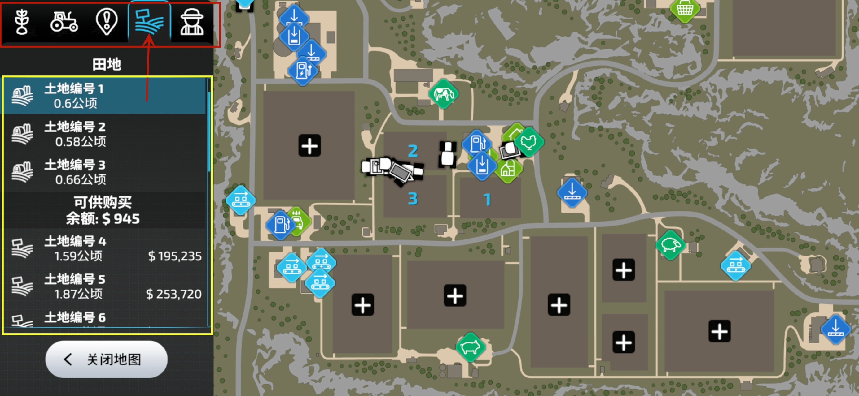 3、在选项卡的顶部,您将看到所有拥有的字段,它们将用数字标记。所有其他数字(如5.6.7)都将位于可用对应部分,并且这些没购买的数字土地将标有“+”符号。