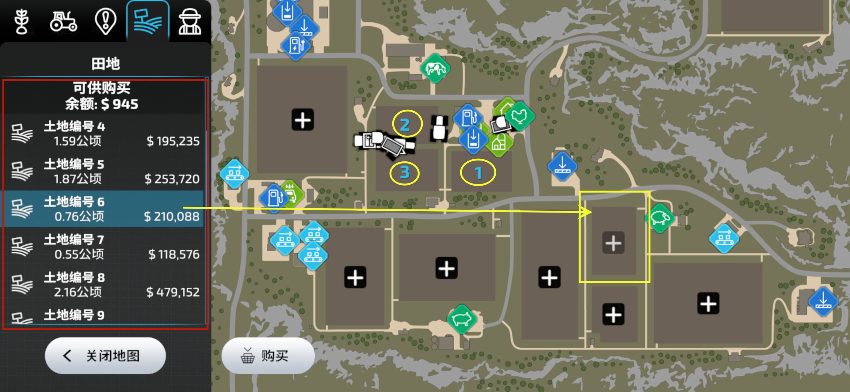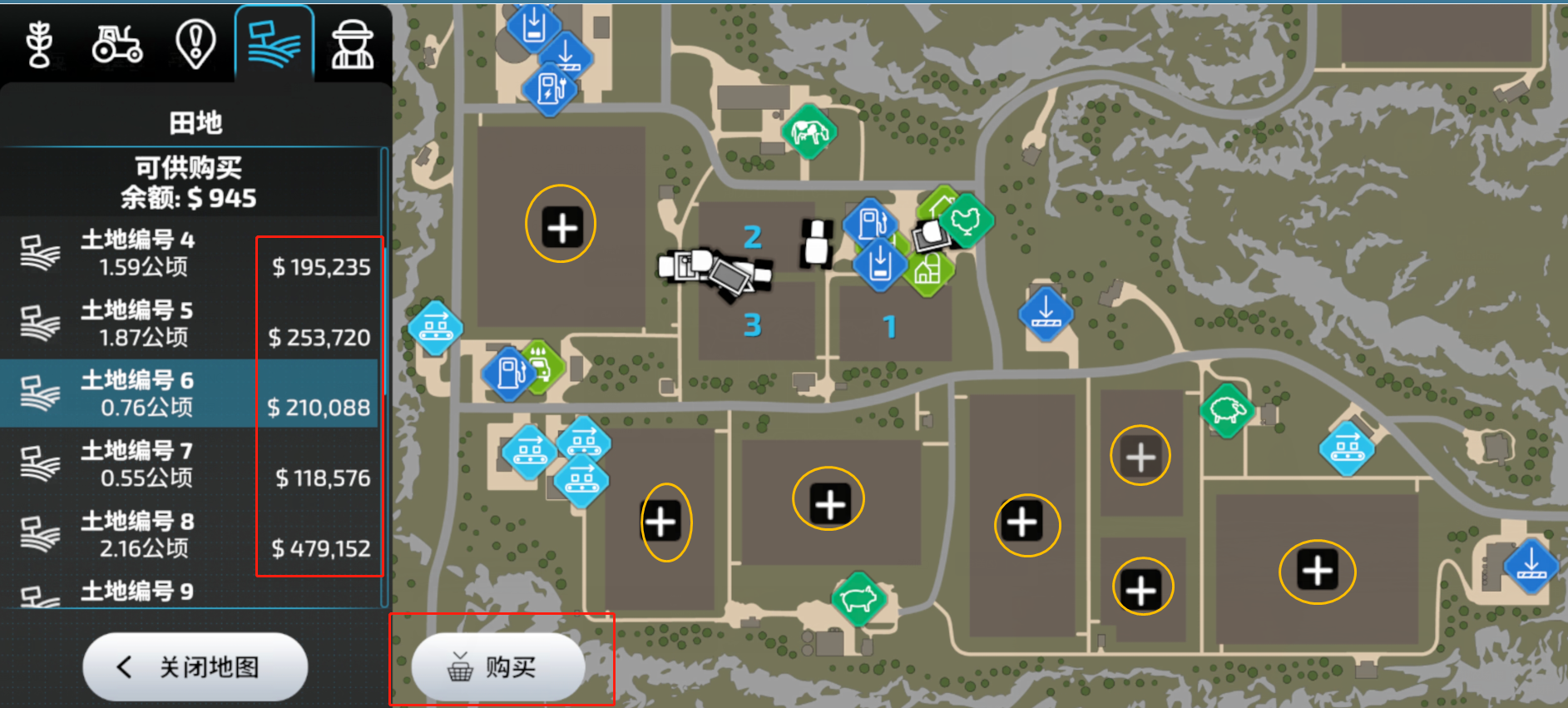 为了让您通过种植谷物和其他作物在游戏中取得成就,您需要购买一些田地。如果不购买,您将无法在田间做任何事情,因此,您需要寻找您想要的特定田地,然后您可以选择购买它并种上农作物。您将从 10 万开始,因此请尽量购买可以为您带来最大利润的有用田地/土地。