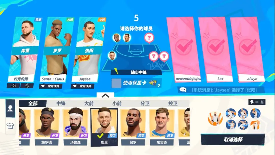 (2)匹配成功后选择球员与11分赛不同,各位巨星需要匹配进入巅峰赛后,再进行球员选择。此外,各位巨星可以看到队友的位置选择,同一球员无法被重复选择,当到达传奇巨星段位,会开启征召模式,届时比赛双方需要轮流选球员,需要注意合理搭配阵容。