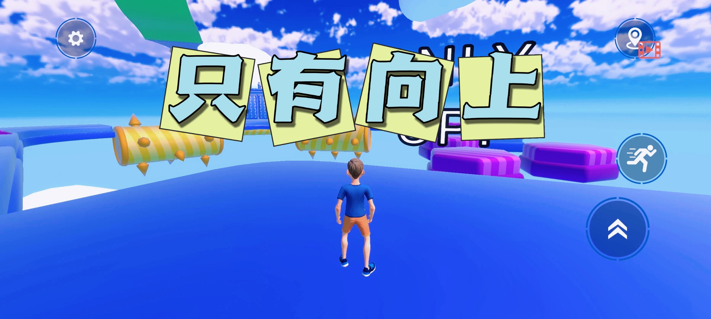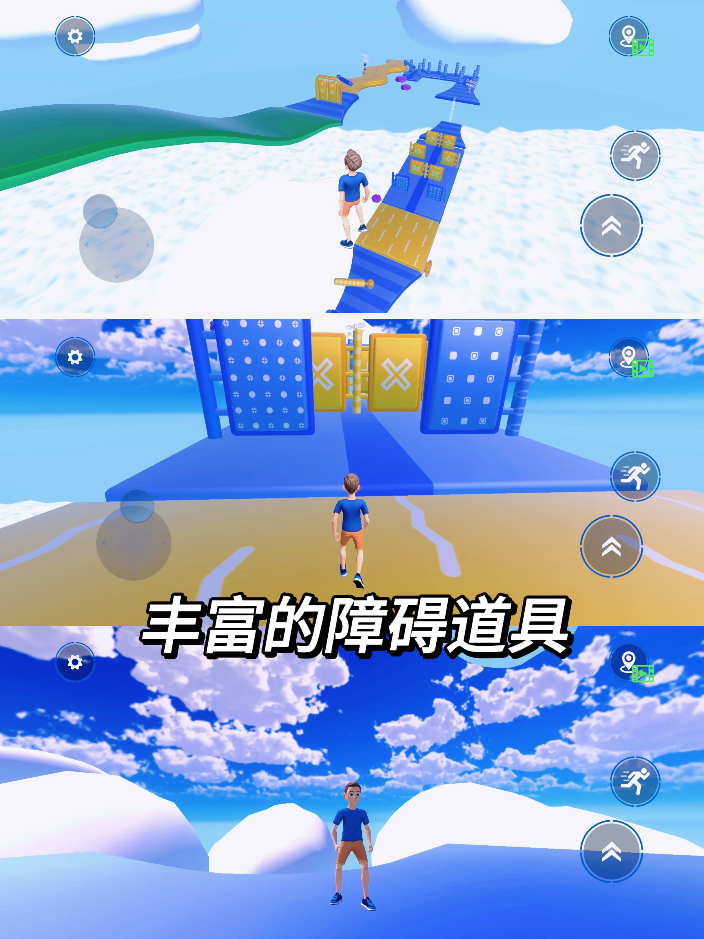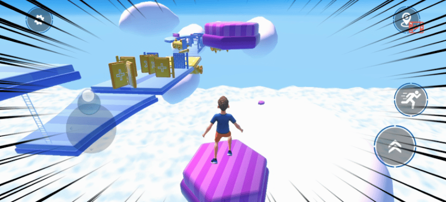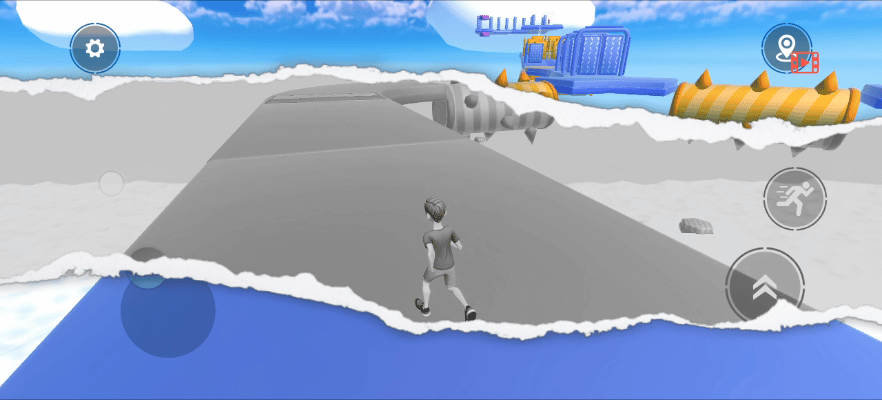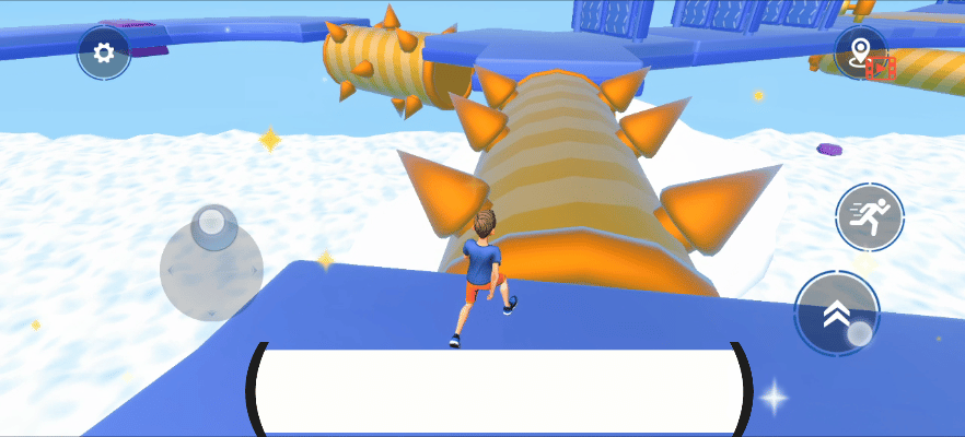 ✍游戏一共有三个按键🚨:控制角色移动的方位摇杆、向前冲刺的按键以及跳跃键。赛道上放满了各种障碍道具🚧,同时赛道两边没有设置边界,走位控制不好会直接让角色从边掉落下去🤯。