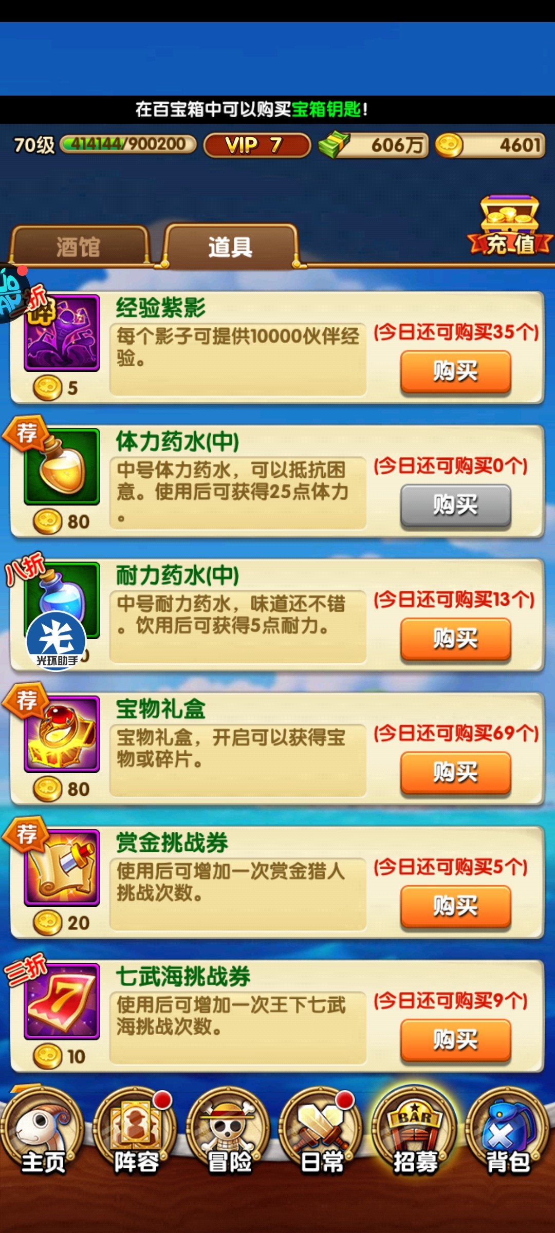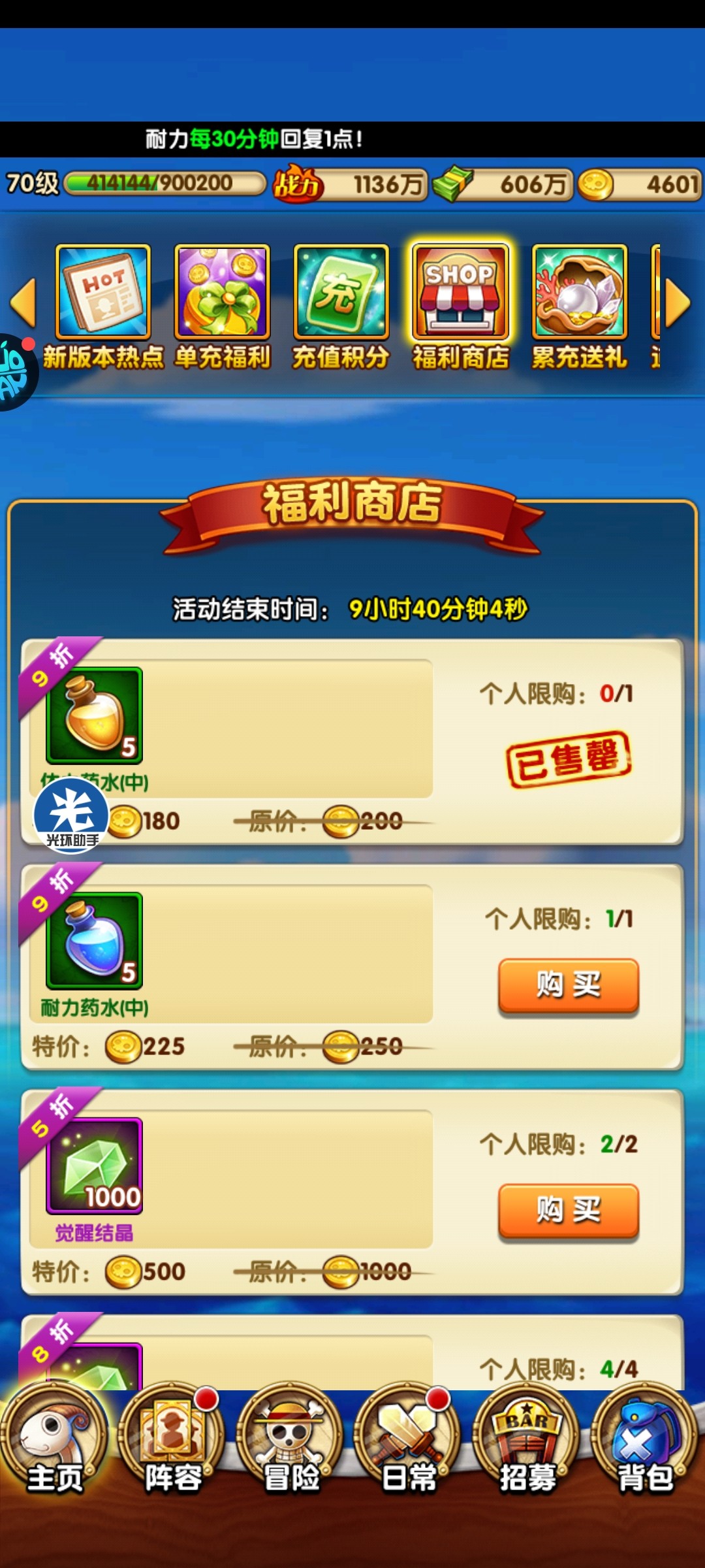 这个游戏等级非常重要,前十四天体力耐力全部买完,十四天后到81级之前体力买满,耐力只买酒馆的5瓶,81级之后福利商店和道具折扣里体力买完后再把酒馆的折扣体力买完,每天2瓶耐力