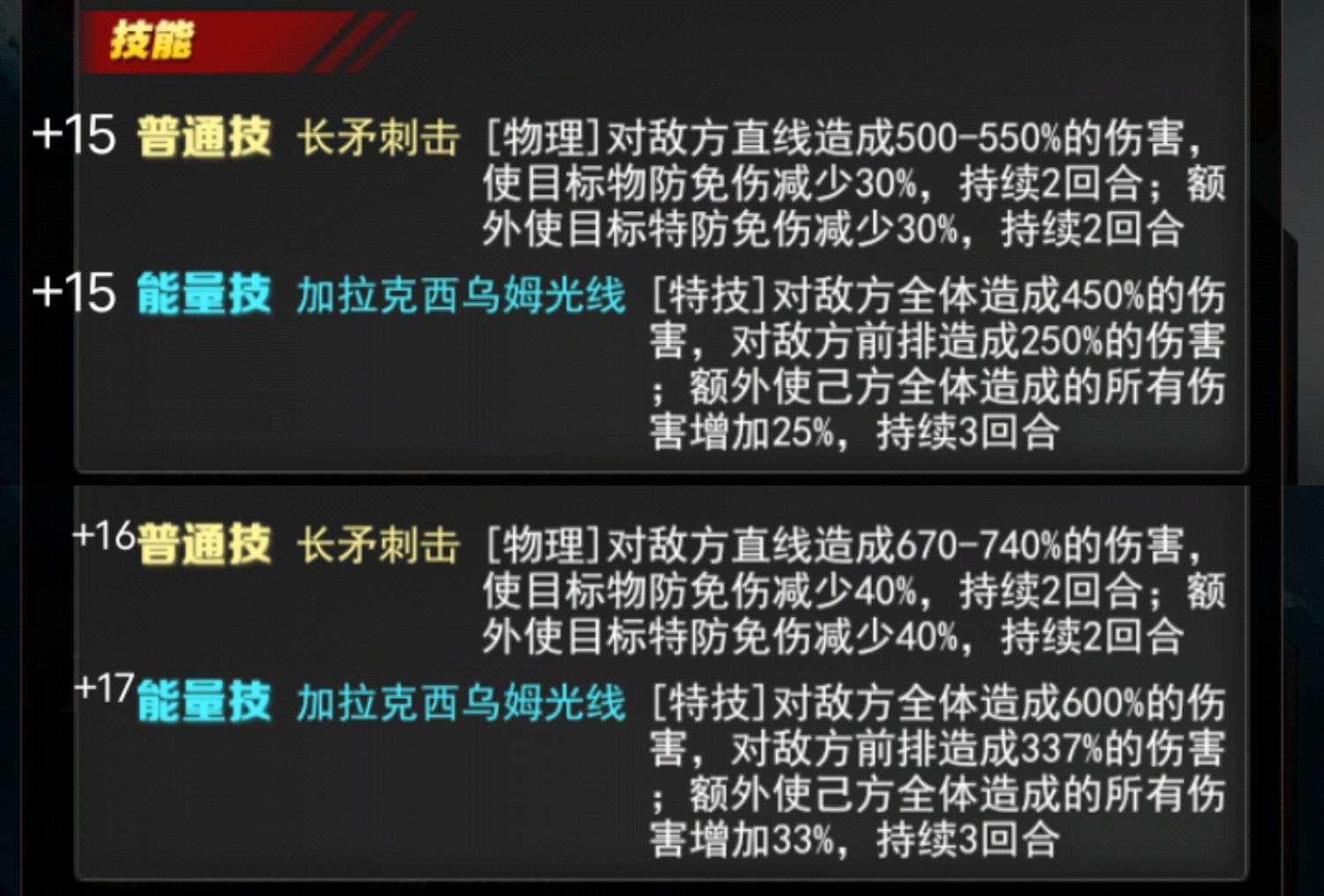 +15 能量技 加拉克西乌姆光线[特技]对敌方全体造成450%的伤害,对敌方前排造成250%的伤害