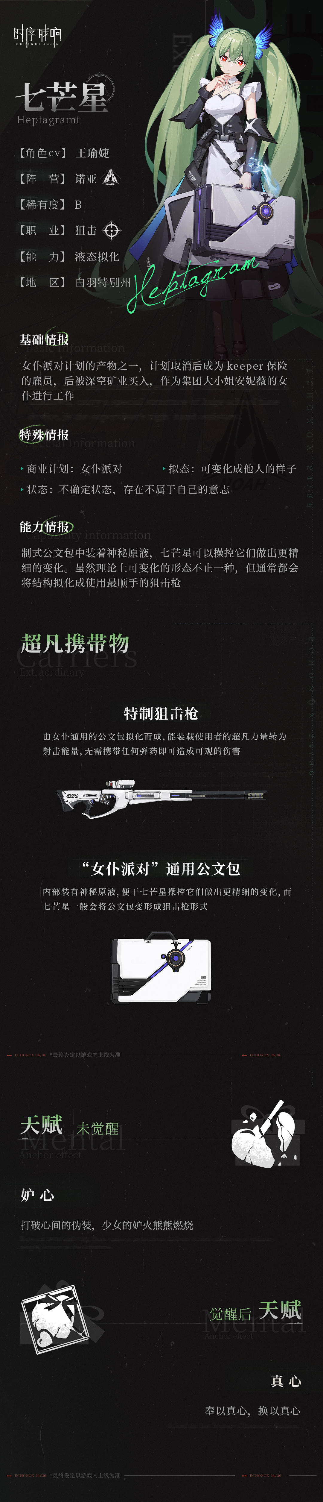 内部简评:深空矿业大小姐安妮薇的女仆,外表美丽,性格高傲,内心忠诚。七芒星拥有自由改变形体的能力,当你看见安妮薇却没有见到七芒星时,请务必提高警惕。