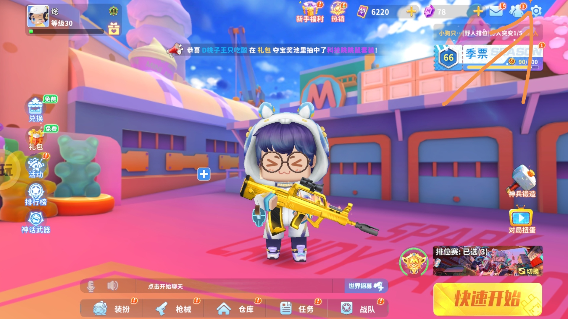 大家好,我是鹤然。迷你枪战精英最近也是有好多新手入坑了。我也是出一期新手必备的上分技巧。学会了,你总能打上枪神的。看到我上面的箭头了吗?那个是设置,里面的菜单很多是对我们上分有帮助的,下面我来给大家教学一下: