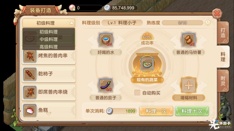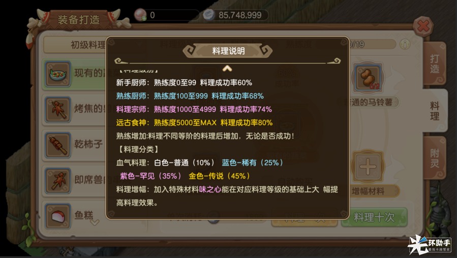 料理宗师:熟练度 1000至4999;料理成功率74%