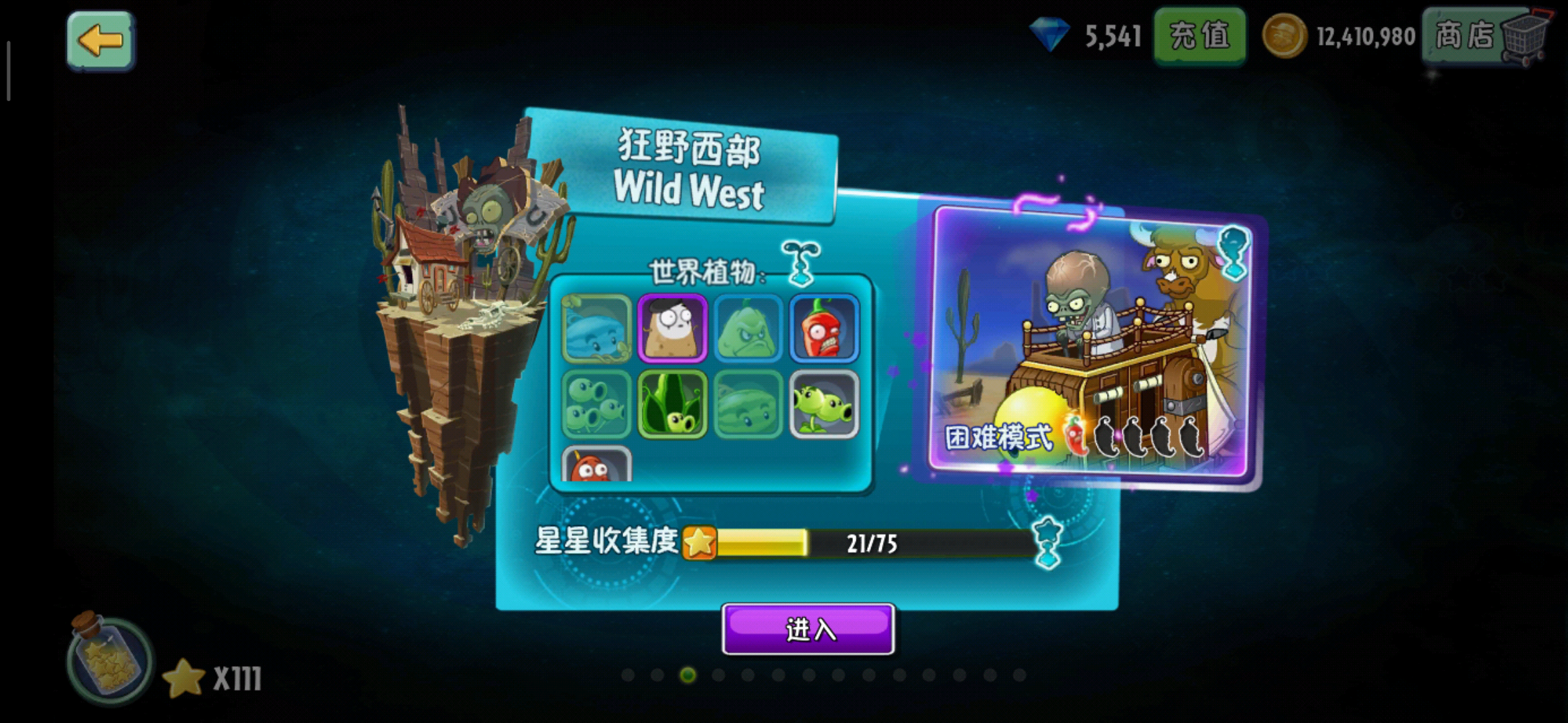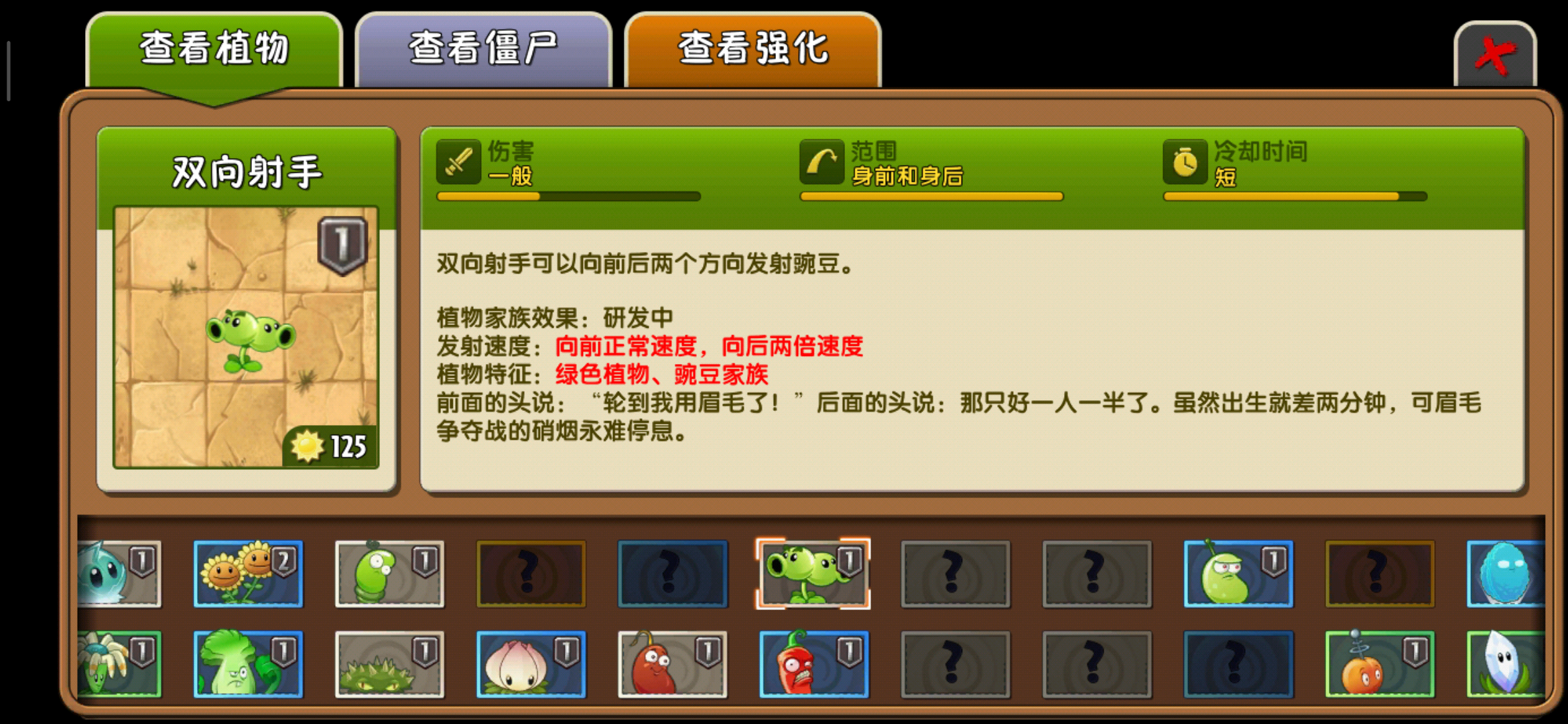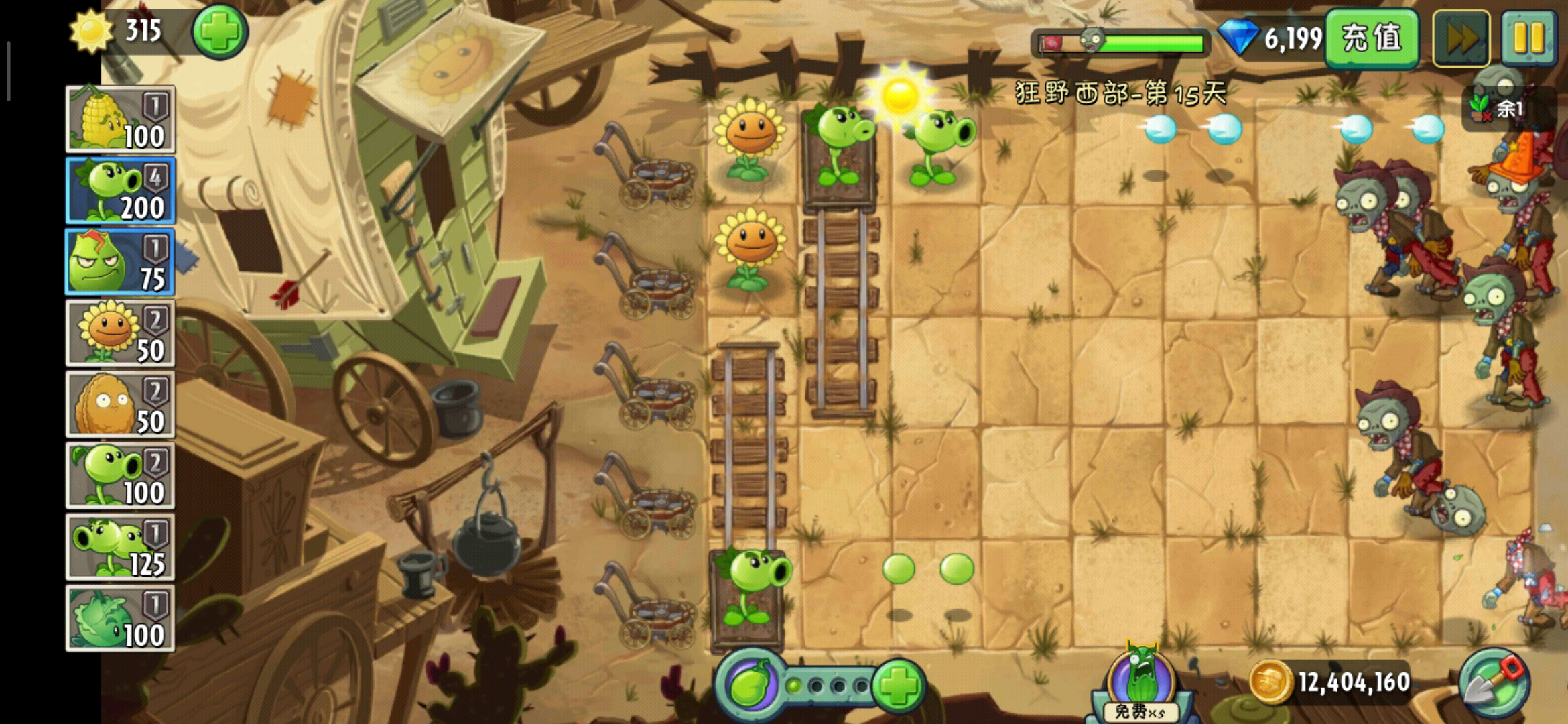 狂野西部世界中添加了新的主线植物——双向射手,巴豆还有闪电芦苇。像双向射手和闪电芦苇这两种植物会一直活跃在狂野西部世界中的,这取决于狂野西部世界的特殊性。狂野西部世界中增添了导轨场景,我们可以将植物种植在导轨在小车上,可以通过拖动小车控制植物所在的位置,这样玩家就可以更加快速的支援防御弱的那一排。而在僵尸中,也有一种僵尸会从僵尸的出发点直接跳到我们的屋子门前,不过万幸的是这种僵尸只能倒走前走,而这个时候就体现出了,双向射手的重要性,我们可以攻击后方来的僵尸。