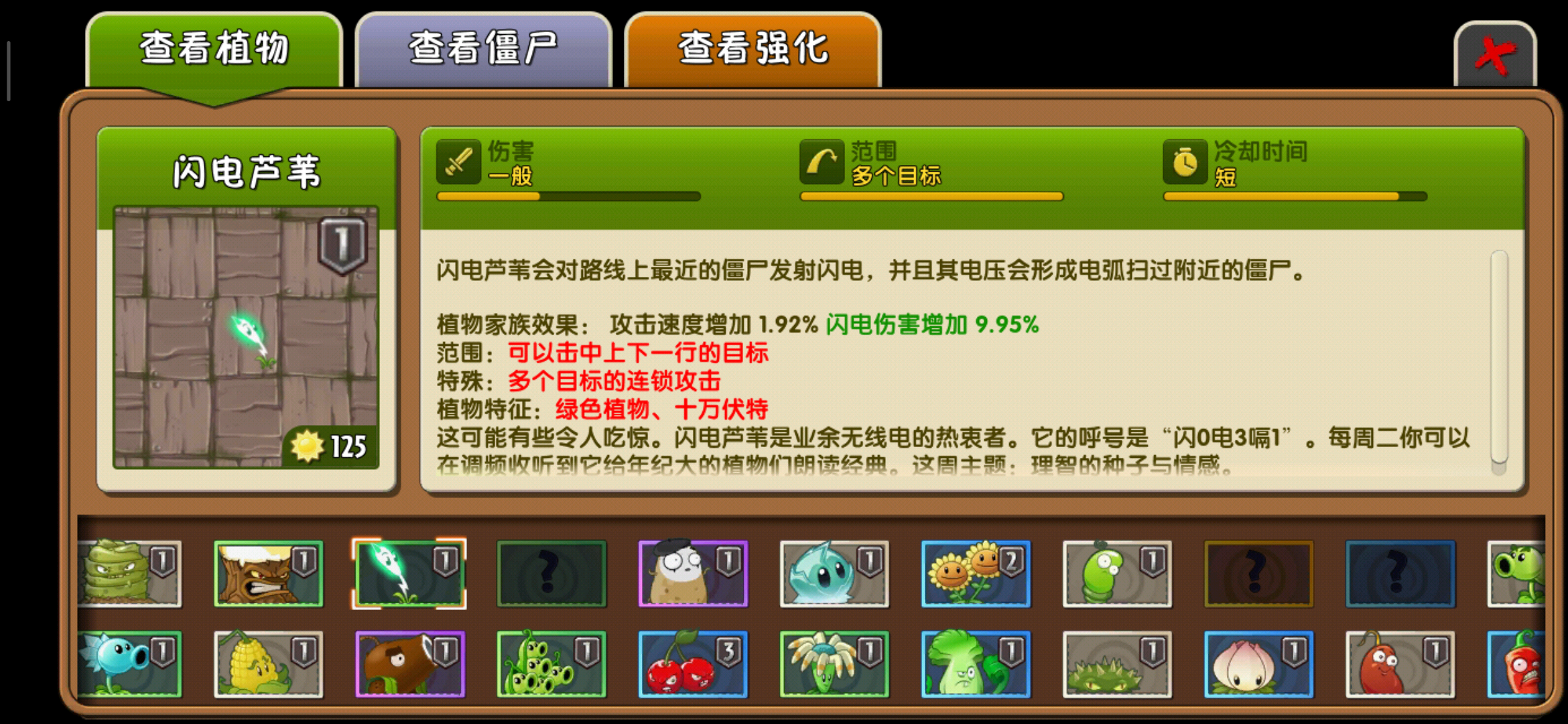 闪电芦苇的作用就更大了,它的作用仍然是针对于这个实际中的某一种僵尸,这个僵尸会抱着一只鸡,然后会用机鸡群去攻击我们的植物,而且这一群鸡的一种速度特别快,但是他们的防御且更不强,闪电芦苇的攻击又属于范围性攻击,攻击这群鸡正是闪电芦苇的拿手好戏!但是闪电芦苇的攻击也并不是很强,对防御力强的僵尸来说,他的攻击跟挠痒痒一样。