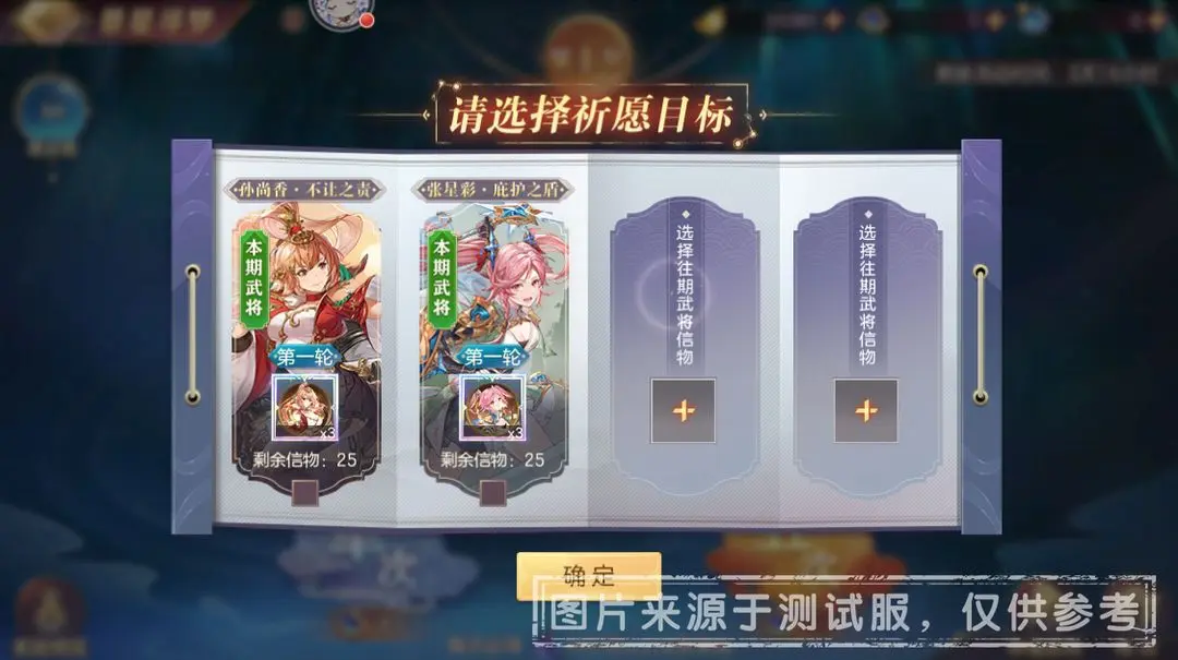 在【景星寻梦】活动中,小将军们可选定4位武将进行祈愿。其中“孙尚香、张星彩”为本期祈愿限定武将,同时小将军可在“吕蒙、曹丕、蔡文姬、马超”4位往期武将中选择2位武将进行祈愿。