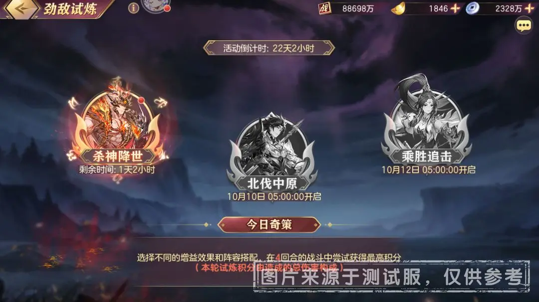 全新策略性首领挑战玩法【劲敌试炼】登场!在活动的第1日,第3日,第5日将分别开启【杀神降世、北伐中原、乘胜追击】3个阶段的挑战。