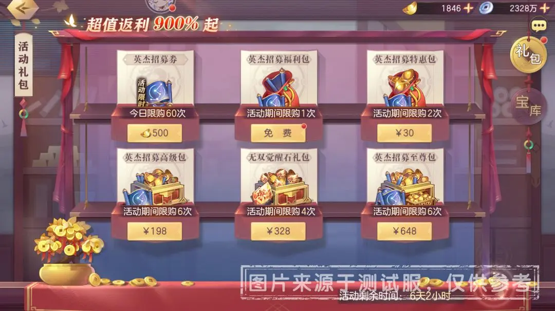无双觉醒石礼包:内含无双觉醒石*6、元宝*3280,售价328元,活动期间限购4次。