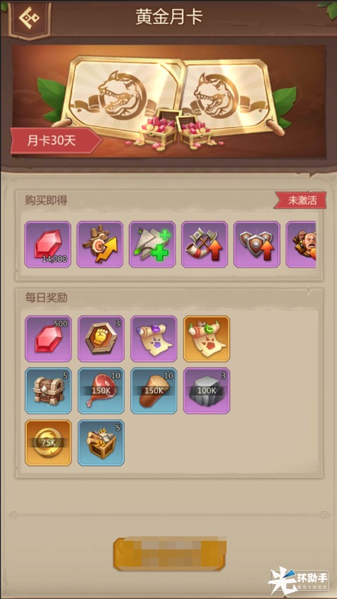 黄金月卡礼包:14000水晶奖励、训练场训练速度+30%(缩短训练时间)、治疗速度+30%(缩短治疗时间)、部队攻击力+8%(提高部队目前攻击力)、部队防御力+8%(提高部队目前防御力)、部队生命力+8%(提高部队目前生命力)、除此之外,每天还能分别获得一个中级和高级捕龙许可证等各种奖励,其他奖励性价比也很高。