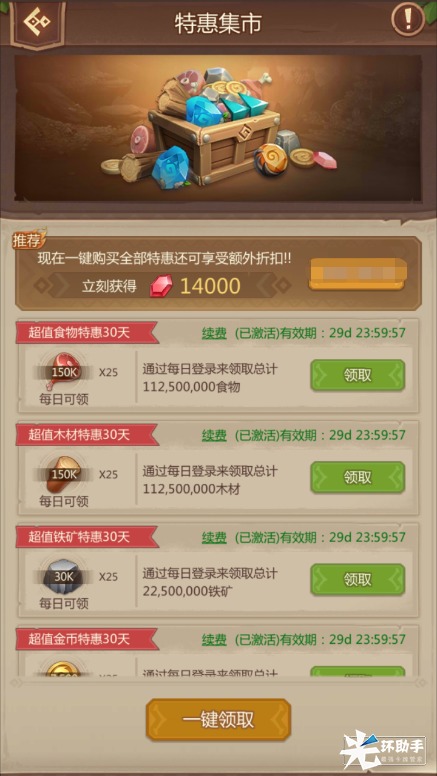 特惠集市:每日可领食物150k*25、木材150*25、铁矿30k*25、金币7.5k*25、加速60m*15、水晶1200、龙晶6w、祝福石*20的奖励。性价比非常高,可领取三十天。