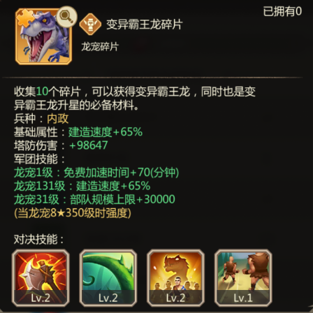 首冲变异霸王龙礼包:属于加成内政龙宠,的军团技能与建设息息相关。前期可以节约很多时间,加速发展,用了就知道有多好!有变异霸王龙的帮助,能在抵御入侵者中快速通关。