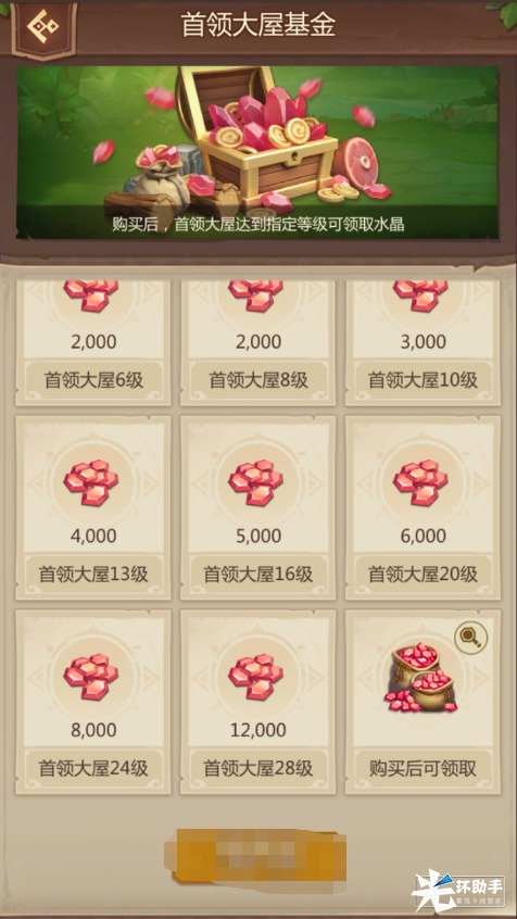 首领大屋基金:购买后。首领大屋达到一定等级可领取水晶,对于爱升首领大屋的玩家来说是一个非常高性价比的礼包,能获得非常多的水晶。