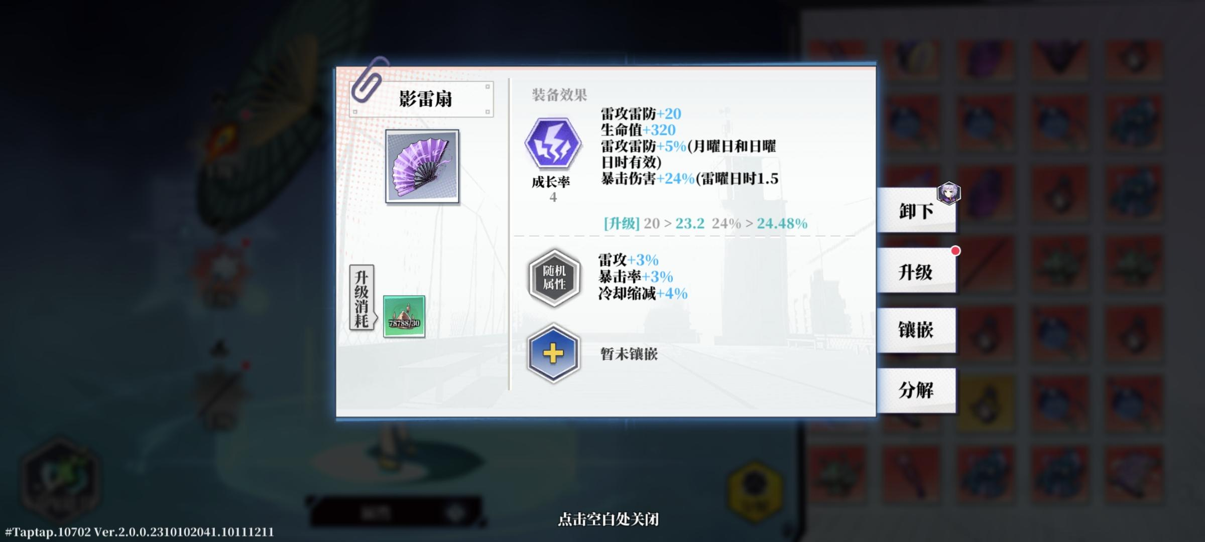 根据不同的日子,选择不同的扇子,当然如果觉得爆伤溢出,可以选择-雷防的怒雷壶。