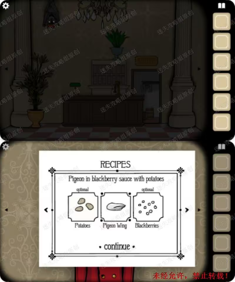 38、首先,不要上电梯。跟乌鸦先生对话也只是让我们去看看能不能帮房间里的客人。转到两扇窗的场景。可以看到一颗流星划过。在乌黑的情况下到处转,每个场景都停留两秒,可以在某个场景看见一双白色的眼睛闪烁一下,点击对应位置,会稍微变亮一点。如此重复四次后多转几次,可以看见服务生又站在电梯边上了,点击服务生,得到马铃薯。土豆炖鸽肉配黑莓酱的第一个配菜到手。上电梯,前往二楼右侧房间,ROOM5,鸽女士房间进入。38、1