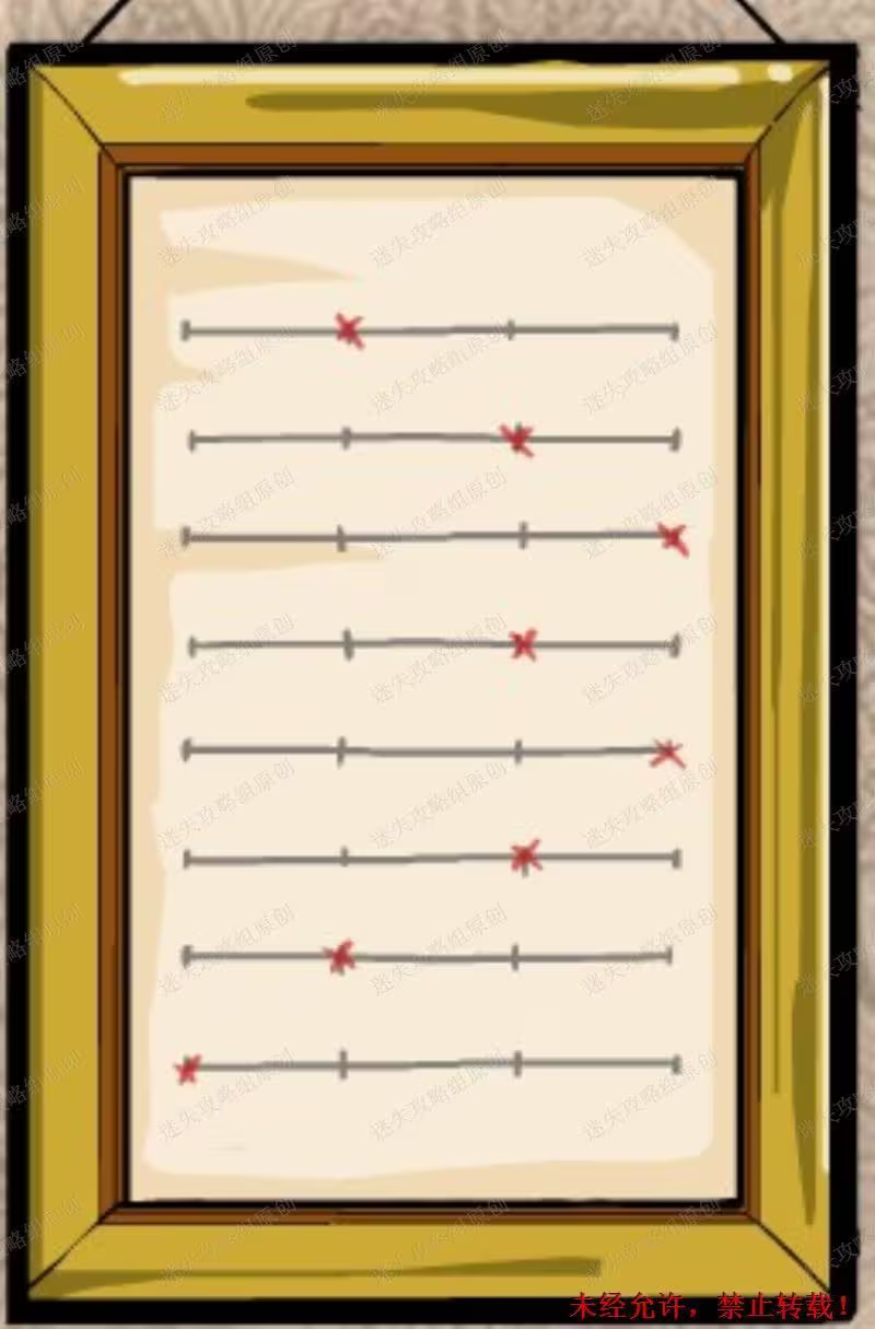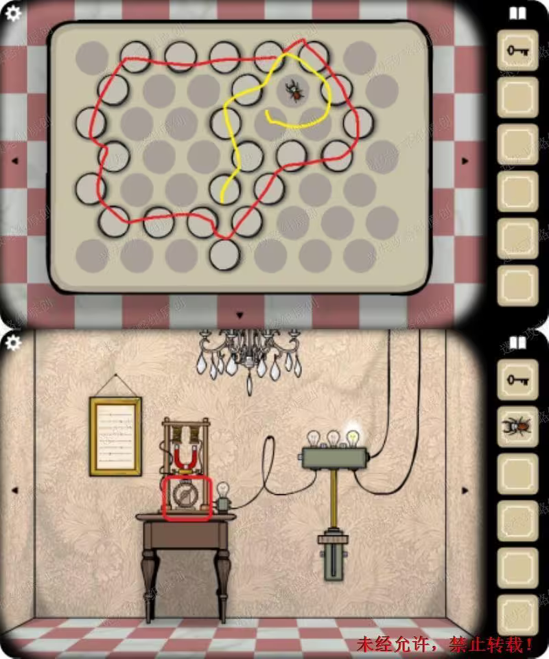 42、回到之前转盘的地方,左下方的方桌点击放大后进入解谜。这里需要堵住虫子的出路,方法很简单,要先外后内,预判虫子想去的方向在最外圈进行封堵。图中演示就是先完成红圈,然后黄圈就随意了。最后得到甲虫。前往下图位置场景,把甲虫放到红框位置,就能点亮第二个灯泡。同时注意边上墙上挂着的密码图案,之后要用。42、1