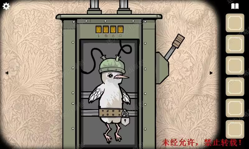 44、前往有门的场景,这里的密码机器上面四个符号对应四位数密码,之前就已经解锁各个符号对应的数字(第39步),这里直接输入8613,打开后是一只被锁住的小鸟。先不要救他,使用边上的开关点他,使劲电,电到吐出东西(第六次嘴里有),点击嘴里得到黑莓,第二个配菜。然后打开两个锁救出小鸟。44