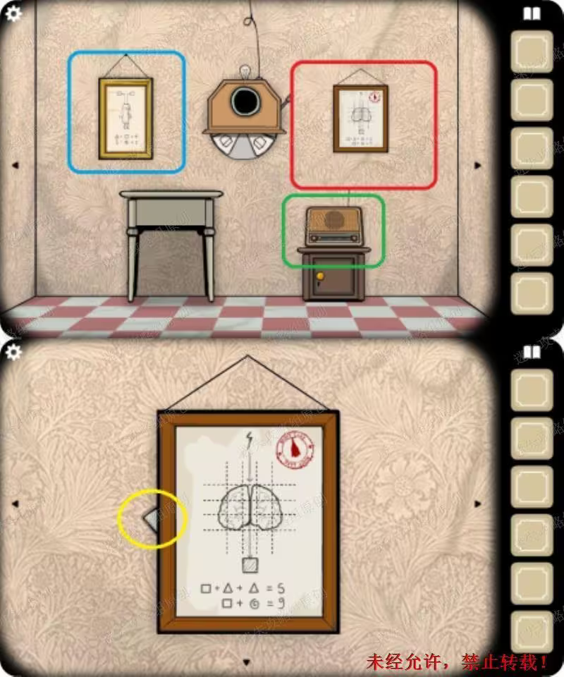 39、进入房间后,先与鸽女士对话,她会毫不客气地让我们给她一些玉米吃。不管她,先去往下图场景。场景中首先是红框位置的图纸,记住图纸上印章的图案(后续电梯旁密码箱要用)有印章的这个图纸背后有一片纸,记得拿。下面绿框收音机背后也有一片纸,拿上。同时红框图纸和蓝框图纸提示组合后得到四个符号的答案:漩涡=6、S型=8、三角=1、方块=3。39、1