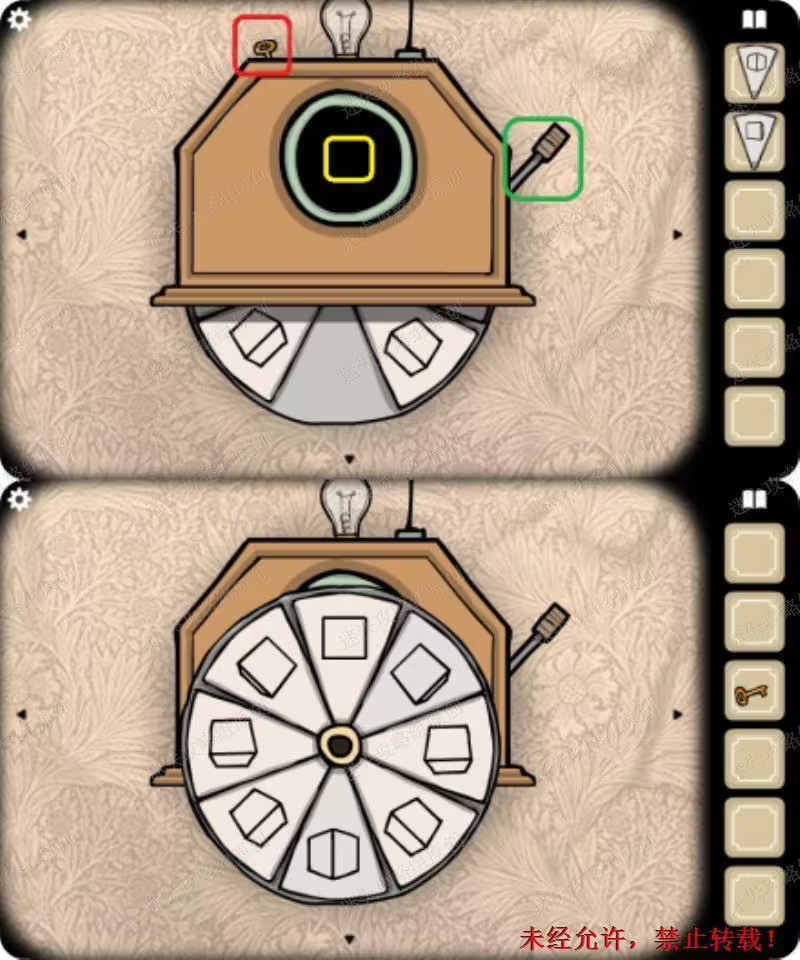 40、同上上图的场景,中间的黑洞机器上点击放大后,先拿走红框处的钥匙。然后点击黄框,插入之前得到的两片纸(顺序如图),再将纸盘装回去(点击纸盘中间的孔)后使用绿框的摇杆。开始转动后灯泡点亮。40、1