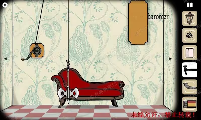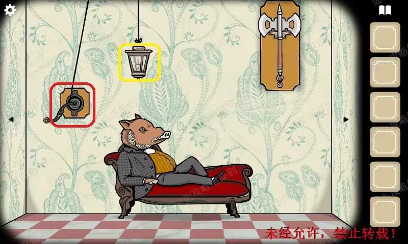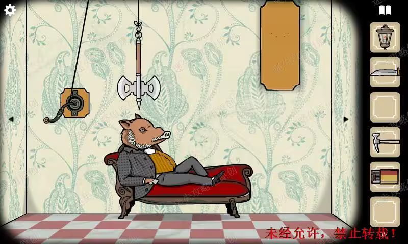 80、去猪先生原来躺着的场所,右上角有把斧头挂着,对它使用榔头,斧头会掉下来,然后多次点击左侧的吊灯摇柄,把绳子放下来,最后跟斧头连接后再用摇杆摇上去。80