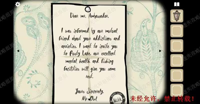 71、转到下图场景,有窗有花有植物这个,先把墙上的信件读了,顺便记住信件的签章,后续要用。信件主要内容:亲爱的大使先生,我从我们共同的朋友口中得知了您的喜好与焦虑,我希望能邀请您前往锈湖,我们的顶级精神疗养&钓鱼设置一定可以帮助您好好地放松一下。您真诚的朋友,猫头鹰先生。71