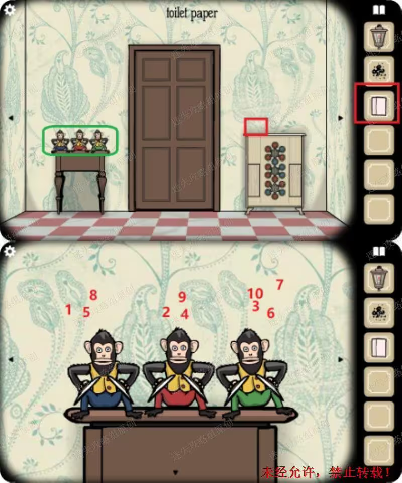 73、转到门的场景,右边的原木色柜子上面有一卷厕纸,点击得到。边上绿框的三只猴子没有提示,直接多次尝试完成顺序即可:注意这里是有规律的,敲几下锣就代表了下一个是左数第几只猴子。具体解法见下图2,最后绿裤子的猴子的头可以摘下,点击得到钥匙。73、1