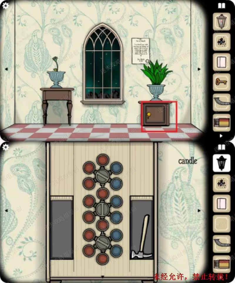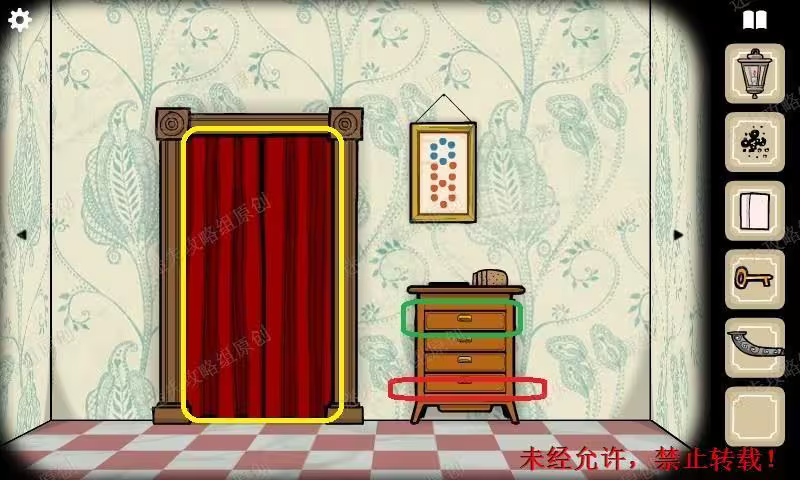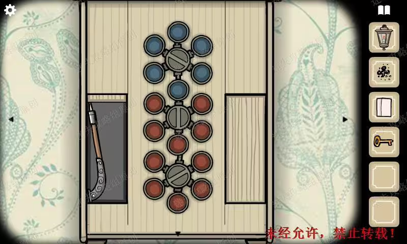 74、厕纸下方的解谜,提示就在红色帘幕的场景墙上。依照提示输入后打开柜子得到烟管。(解谜方面,一个个转就行了,没什么难度。就是时间长)74、1
