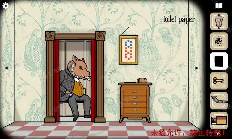 76、直接把三明治给野猪吃。多次点击请他吃完后厕所里可以找到野猪,给他厕纸。然后帘幕会自己拉上,有门的场景边上柜子上的厕纸也会刷新,再去拿了,这样做三明治、给猪吃、拉、连续三次。76