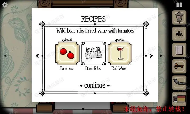 68、首先,切换场景,在猪先生坐的地方,下图红框处有一杯红酒,点击后得到西红柿野猪肋排配红酒的第一个配菜,红酒。68