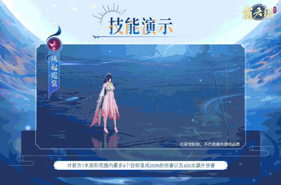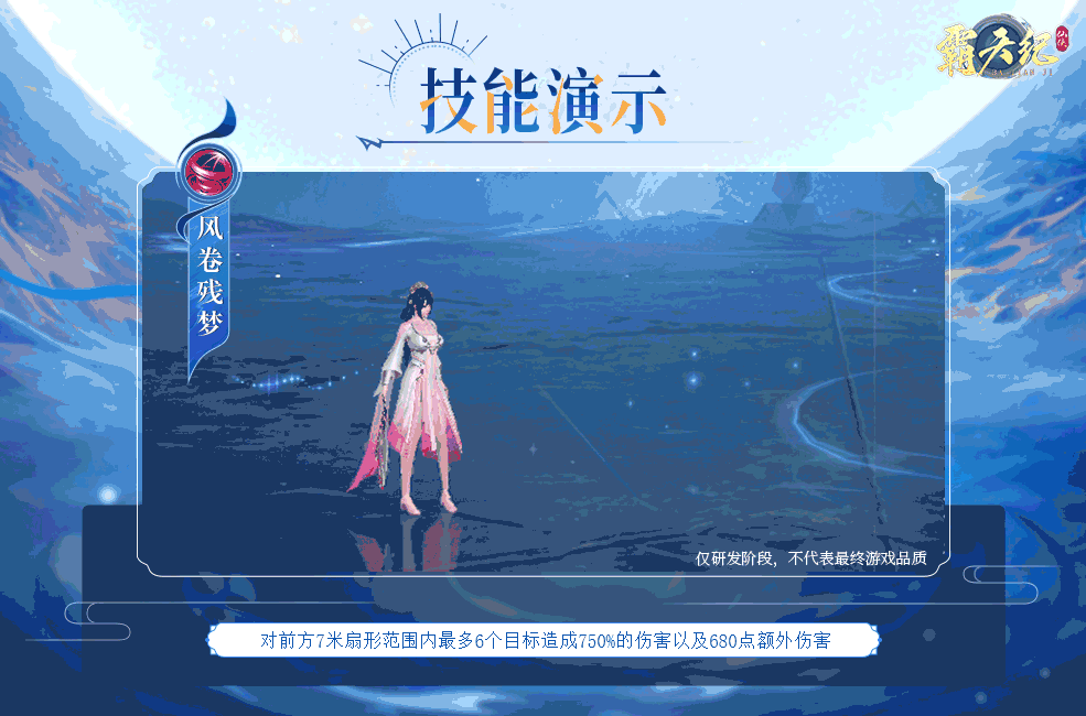 对前方7米扇形范围内最多6个目标造成750%的伤害以及680点额外伤害。