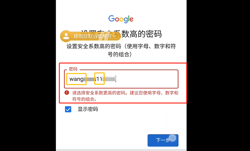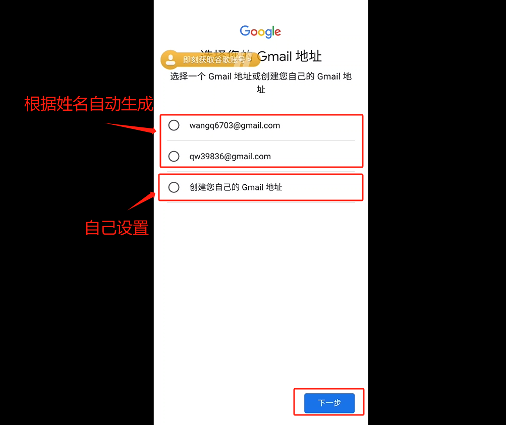 ⑧设置谷歌登录账号,前两个是根据“姓名信息”自动生成的,也可以选第三个自己设置登录账号