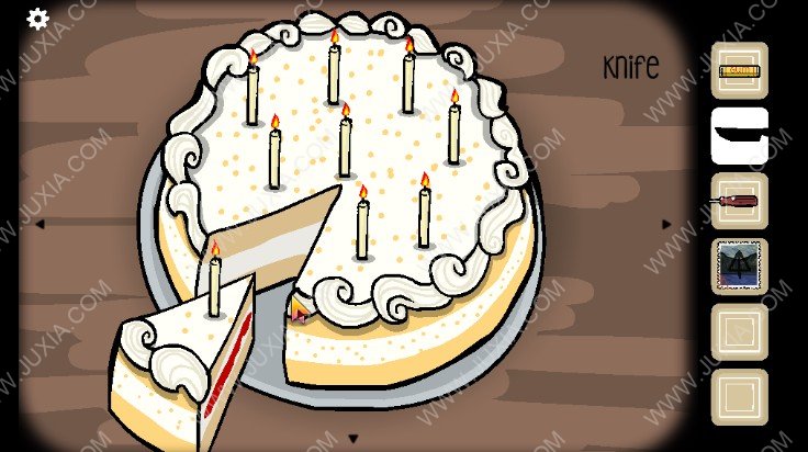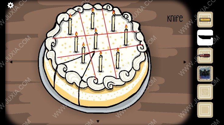14.点击下图红色框位置的蛋糕,用刀子将蛋糕如下图所示进行切割(这里不来好截图,小编在下图用了红色线来代替用刀切的线条,这个线条类似一个“井”字)随后蛋糕上面的蜡烛便会点燃,点击获得已经切割好的蛋糕(可以看到蛋糕中间会流出鲜血)。