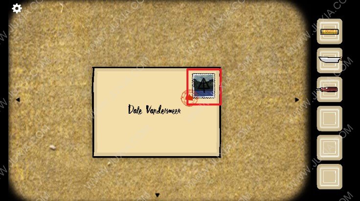 3.来到老爸的位置,我们可以看到信封飞到了老爸左边的地上(下图红色框),首先我们带点击获得信封上面的邮票,然后点击查看信的内容。