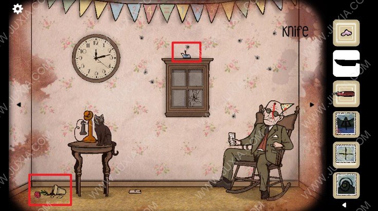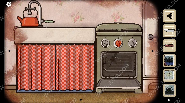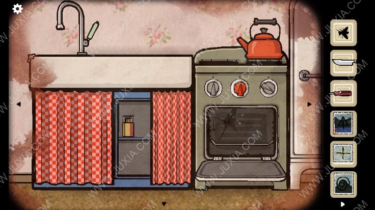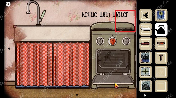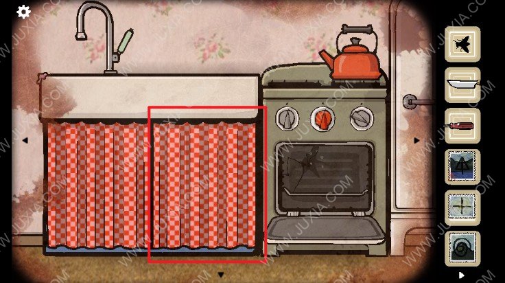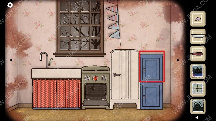 34.用我们获得的钥匙打开下图红色框位置的柜子,打开之后会从里面飞出一只苍蝇,这里我们先不要管,先拿到红色水壶。