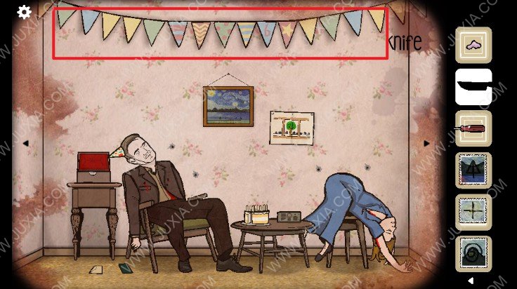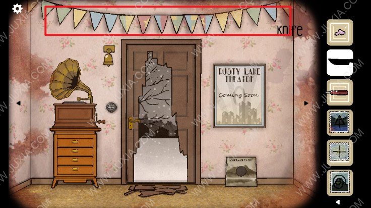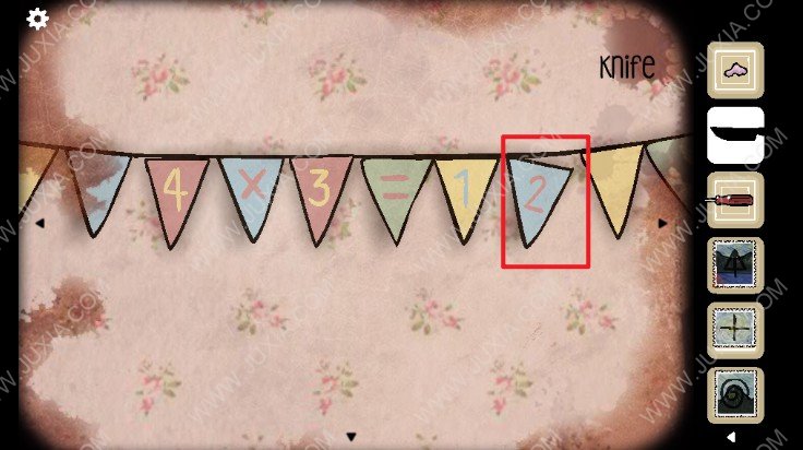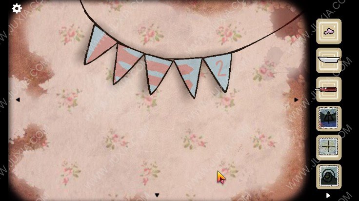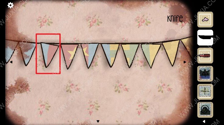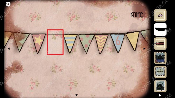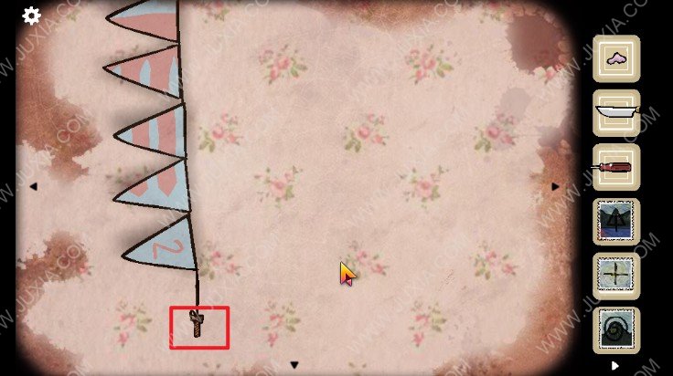 33.点击下图红色框位置,将我们获得的所有旗子按照下图所示排列方式挂入其中,然后点击画面,我们可以看到上面的绳子因为承受不住旗子的重量而掉落,点击获得红框处绳子尽头的螺母。