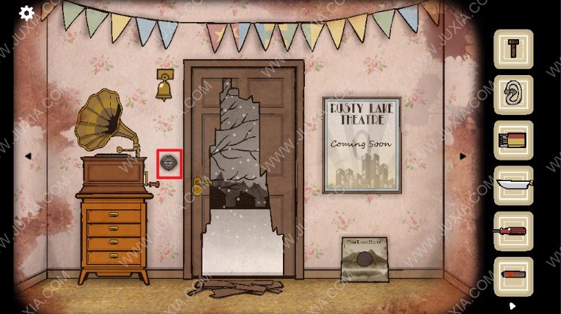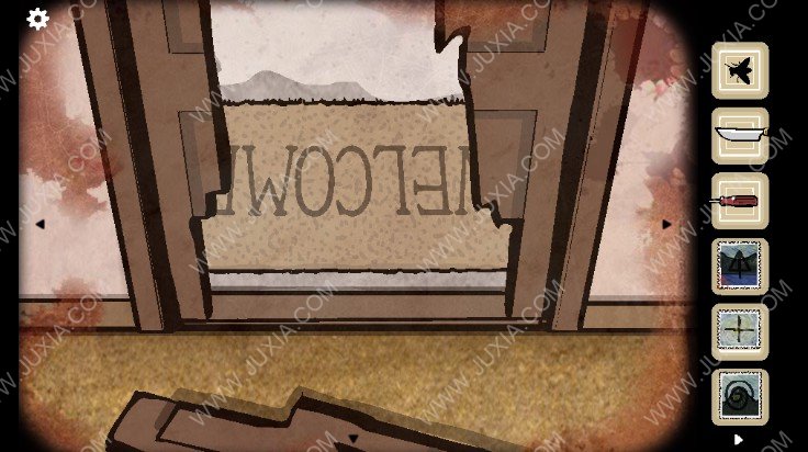 40.来到碎掉的门位置点击下图红色框位置查看,将开水倒入下图位置便可以露出下方的地毯,点击地毯将其翻开获得下面的第二块电池。
