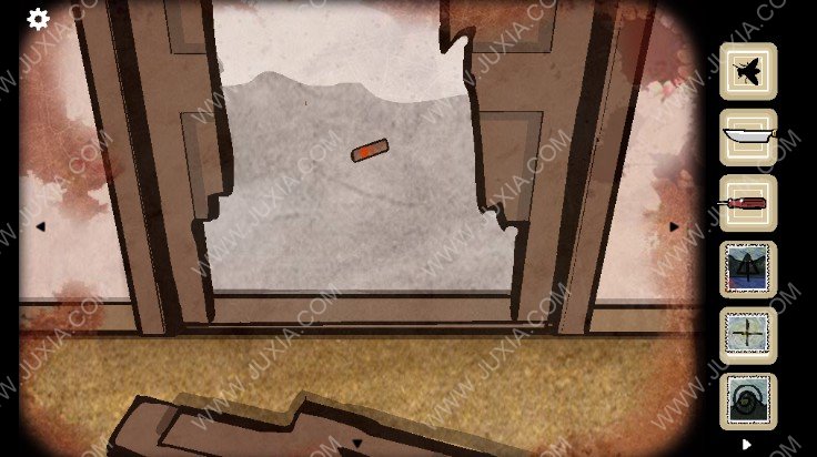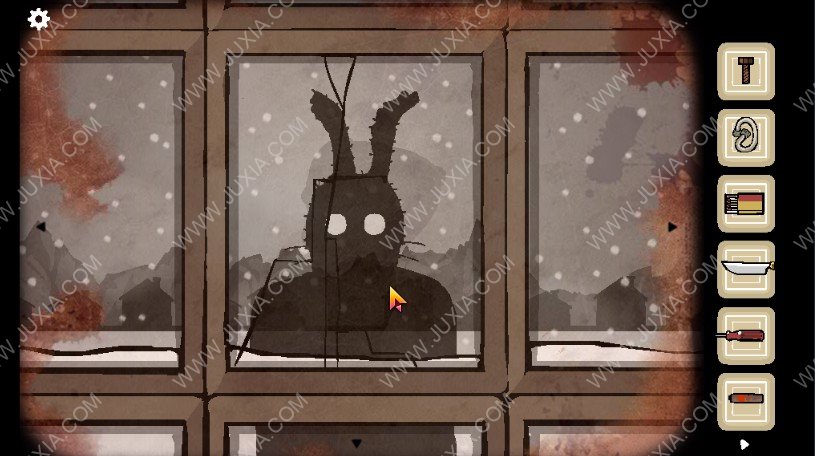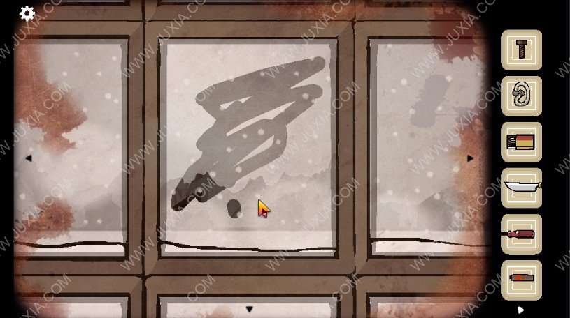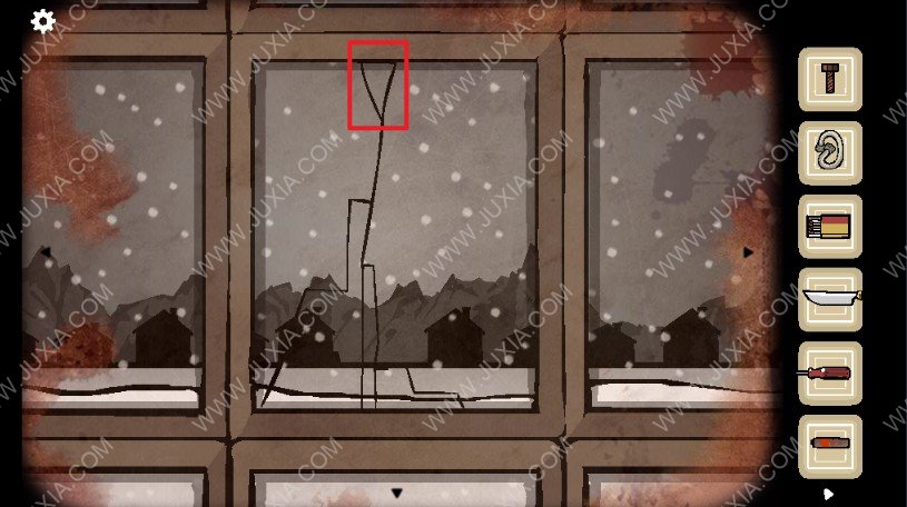 44.通过下图红色框位置的画,我们再下图的窗外也画出树的轮廓,这时一团黑影便会突然出现,将玻璃砸碎。