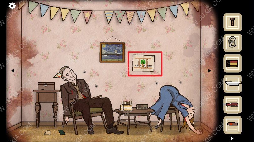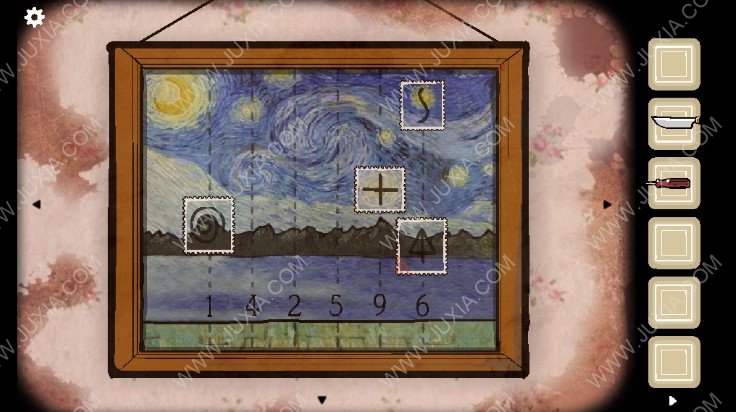 42.我们来到下图油画位置将我们获得的邮票按照下图所示进行摆放(根据邮票上面的图案在油画上面找出对应的位置),我们可以获得一个1966的数字提示。