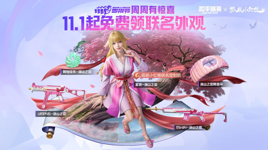 还有苦情巨树图样的降落伞、狐妖玉佩样式的背包挂件,涂山粉色系的UMP45及Mini14枪皮,全部免费,11月1日起,玩家可以登录和平精英免费领取联名外观,每周解锁一个惊喜福利!