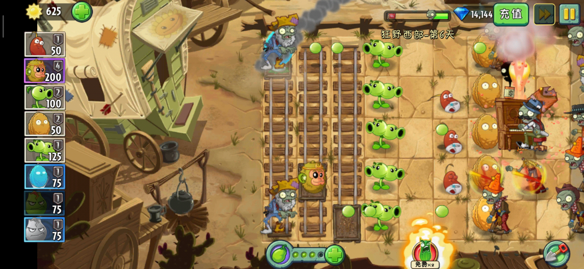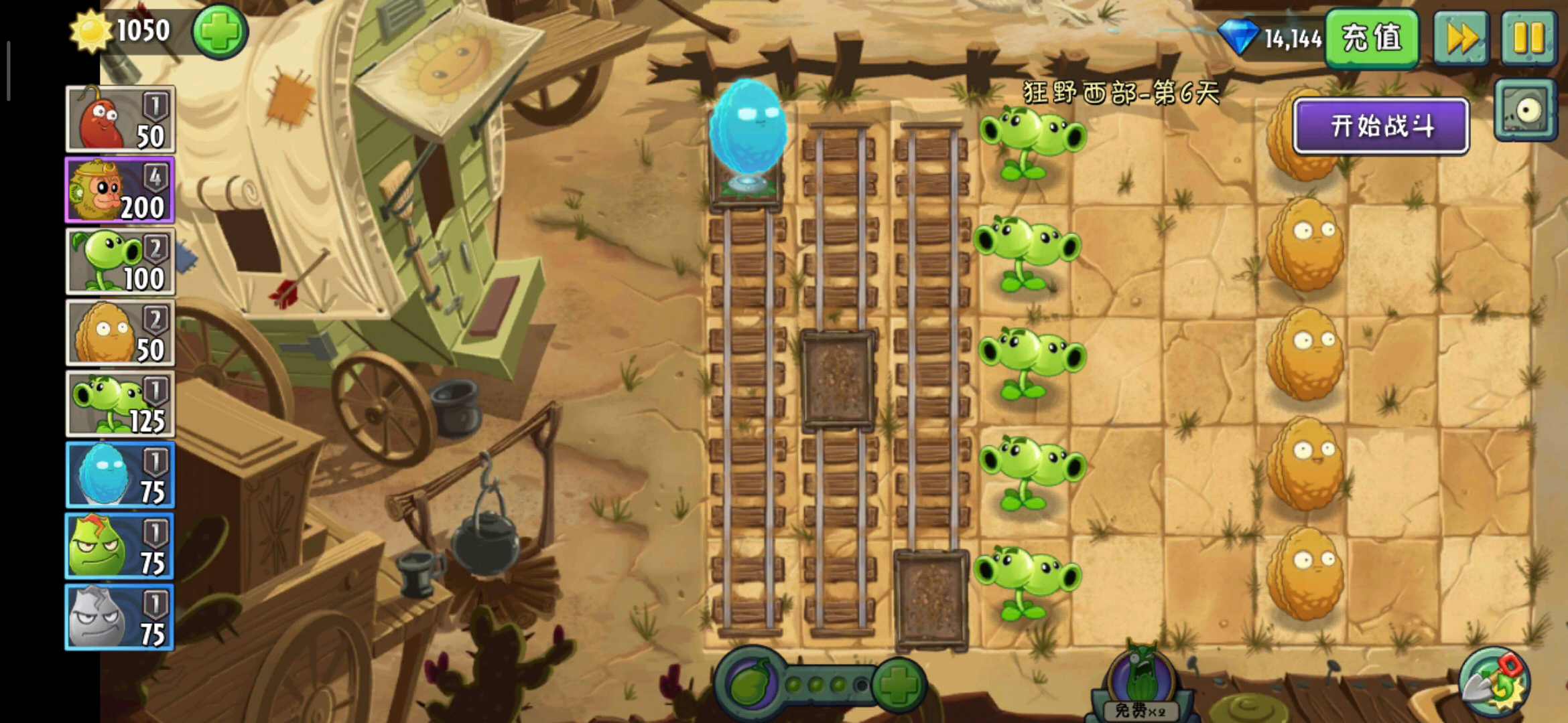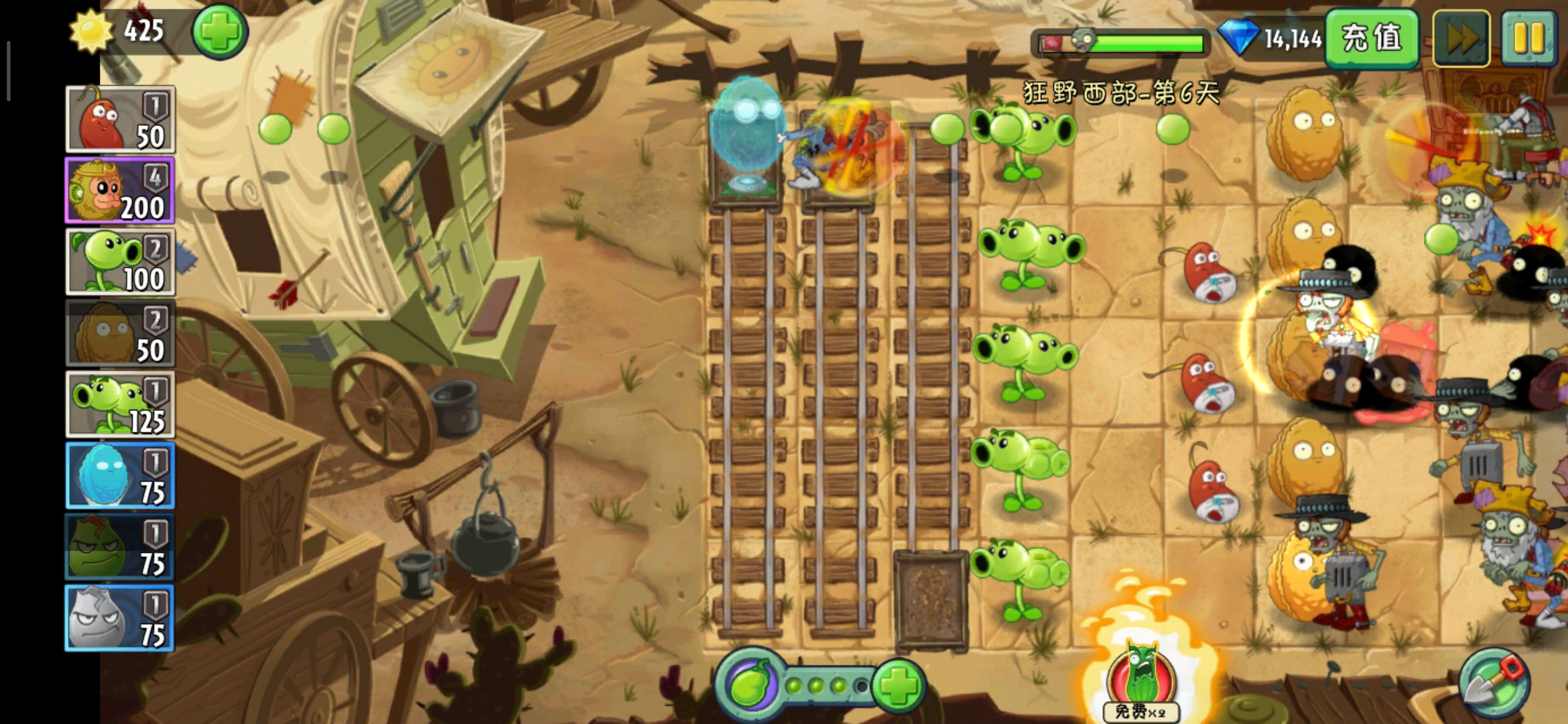当然也可以只选择种植一列全系坚果,剩余的太阳量还足够我们挥霍一下,我们可以选择种植一株或者两株植物在导轨上,我建议是伤害比较高的,比如说双重射手或者猕猴桃,当然,猕猴桃是异常合适的,他的金箍棒在碰到像是后会在原地,持续攻击的对后面来的僵尸也会造成伤害,所以我们就可以拖动小车,让猕猴桃活跃在五排之间,如果遇到了特别大的压力,我们就用岩浆番石榴清理掉这些僵尸,但是岩浆番石榴的伤害对于带栅栏的斗篷僵尸会弱一些。