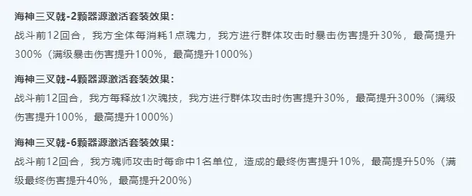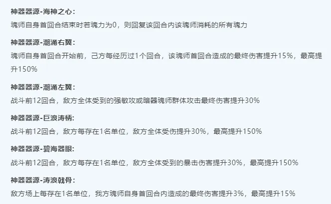 接着这一堆器源里面,最主要的就是左翼、器眼和涛柄三个,都是属于战斗前12回合的增伤,因为海神三叉戟其实是一个更加偏向于短图或快速PVP增伤的神奇,但其规则里面也说了所有12回合前的增伤在12回合后也可以生效,不过只能继承50%的生效效果,所以这三个12回合前的增伤效果大家可以在长图中也能享受到。