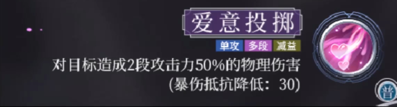 正宫红雅尔的普攻是两段伤害,能够降低对方的暴伤抗性。从后面的携战技能来看,普攻附带的效果有相当高的触发率。同时,我们也可以看出红雅与吃暴击的直伤型体系非常契合,无论是追击队还是核爆流阵容都非常适合。