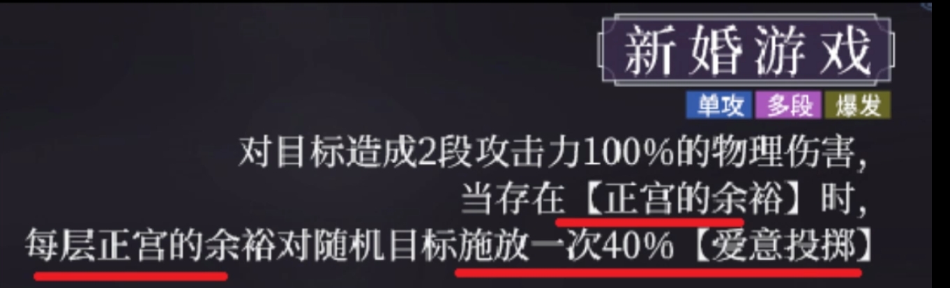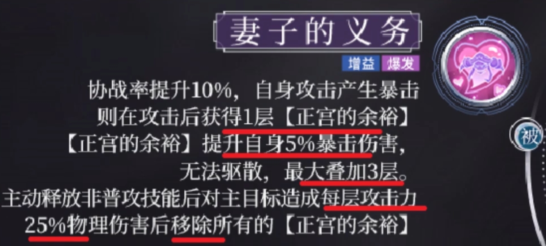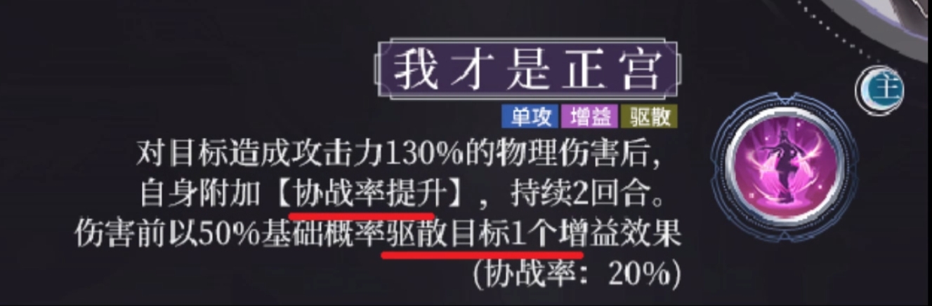 红雅尔的主动技能是“我才是正宫”,可以造成单体伤害,提升协战率。在造成伤害之前,有一定概率驱散,敌人一个增益效果。这是非常典型的一层层驱散敌方buff属性,直击内心的伤害技能。驱散能够消除对方伤害减免等效果,再结合其被动技能就能打出非常爆炸的伤害。