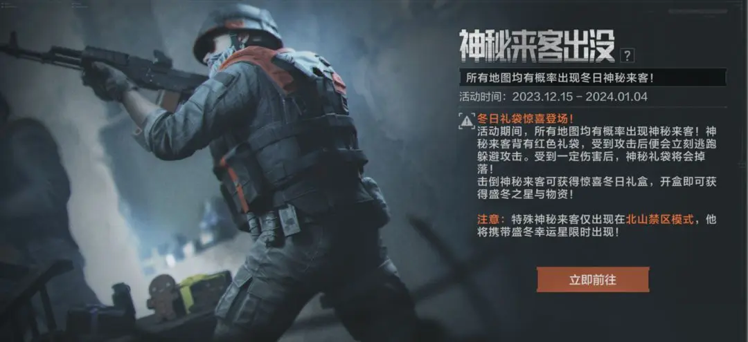 还有神秘来客出没,将背着红色礼袋在暗区所有地图出现,击倒神秘来客将获得特殊道具盛冬之星!