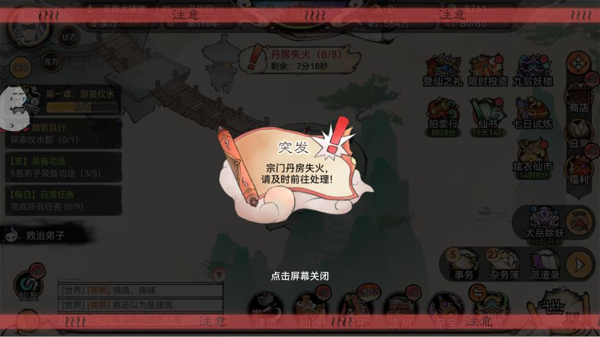 宗门每隔十二小时会有一次突发事件,并且在经过优化之后,只有当祖师处于宗门未打开任何界面时才可以触发突发事件,目前已知的突发事件有:妖兽入侵、丹房失火,以及周期性活动时会有抓草灵和喂养瑞兽